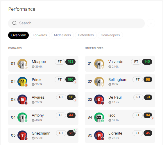 Forwards / Midfielders / Defenders / Goalkeepers Tabs