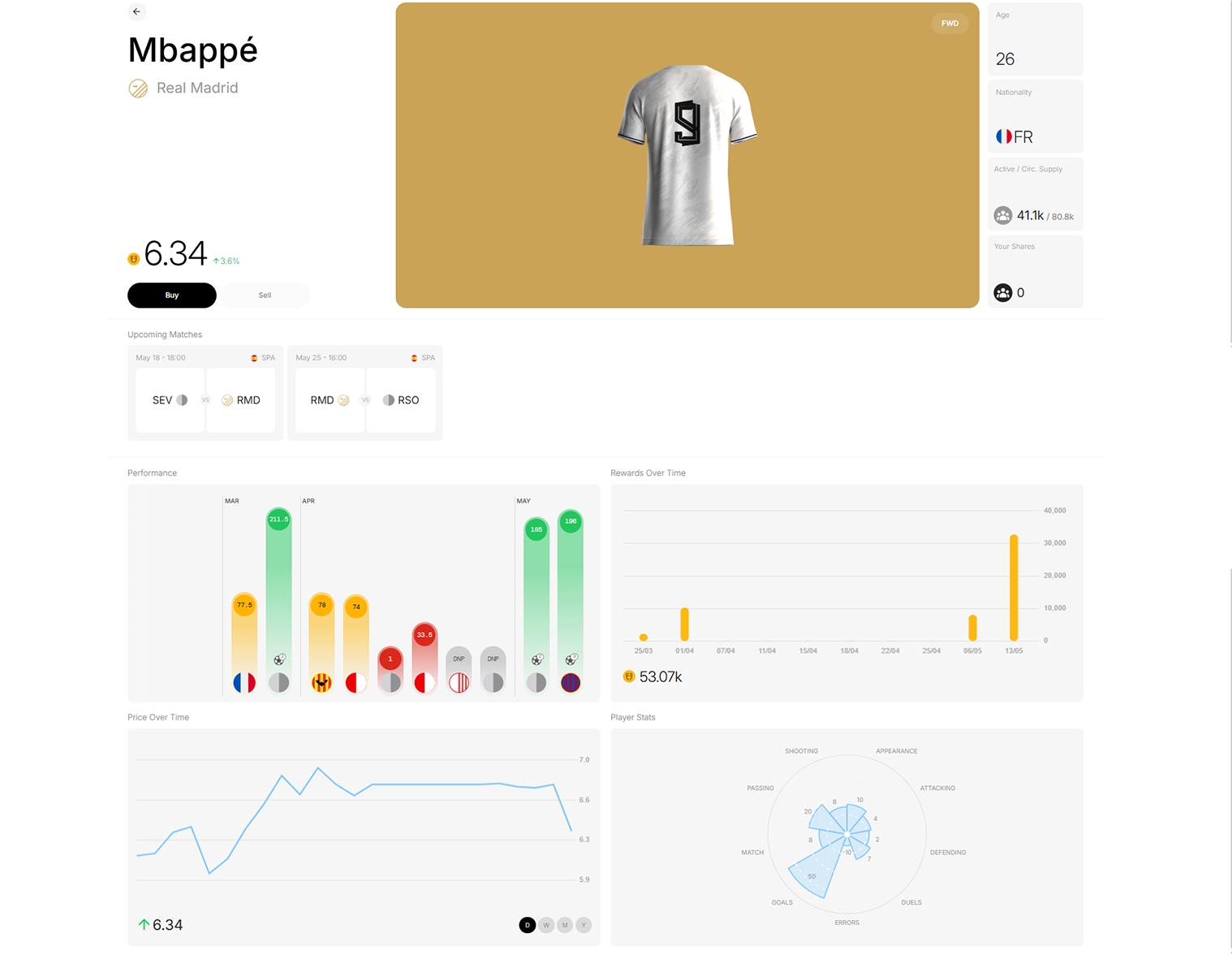 You can then see the overall player market, with each player's price, 24H price movement and a buy or sell option (if you own shares).